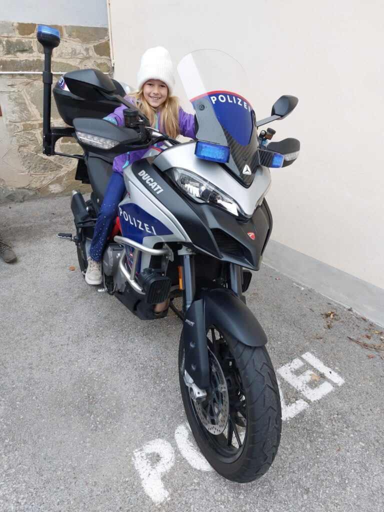 Auch im Polizeiauto und auf dem Polizeimotorrad durften die Kinder Probe sitzen.