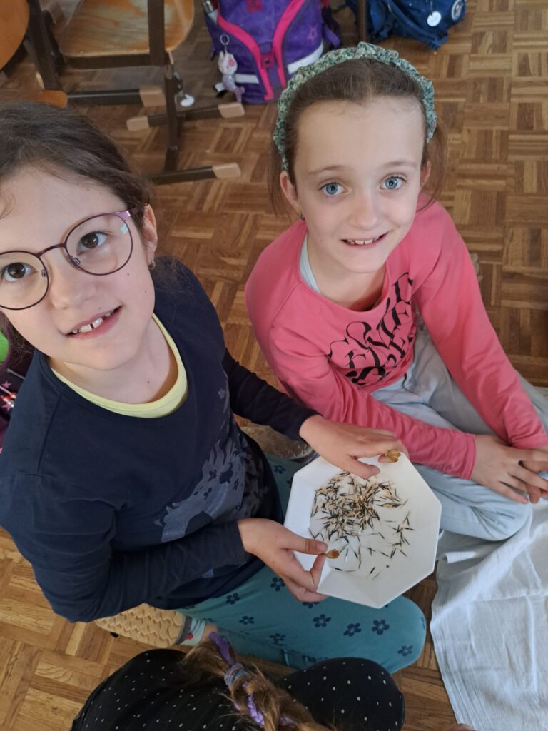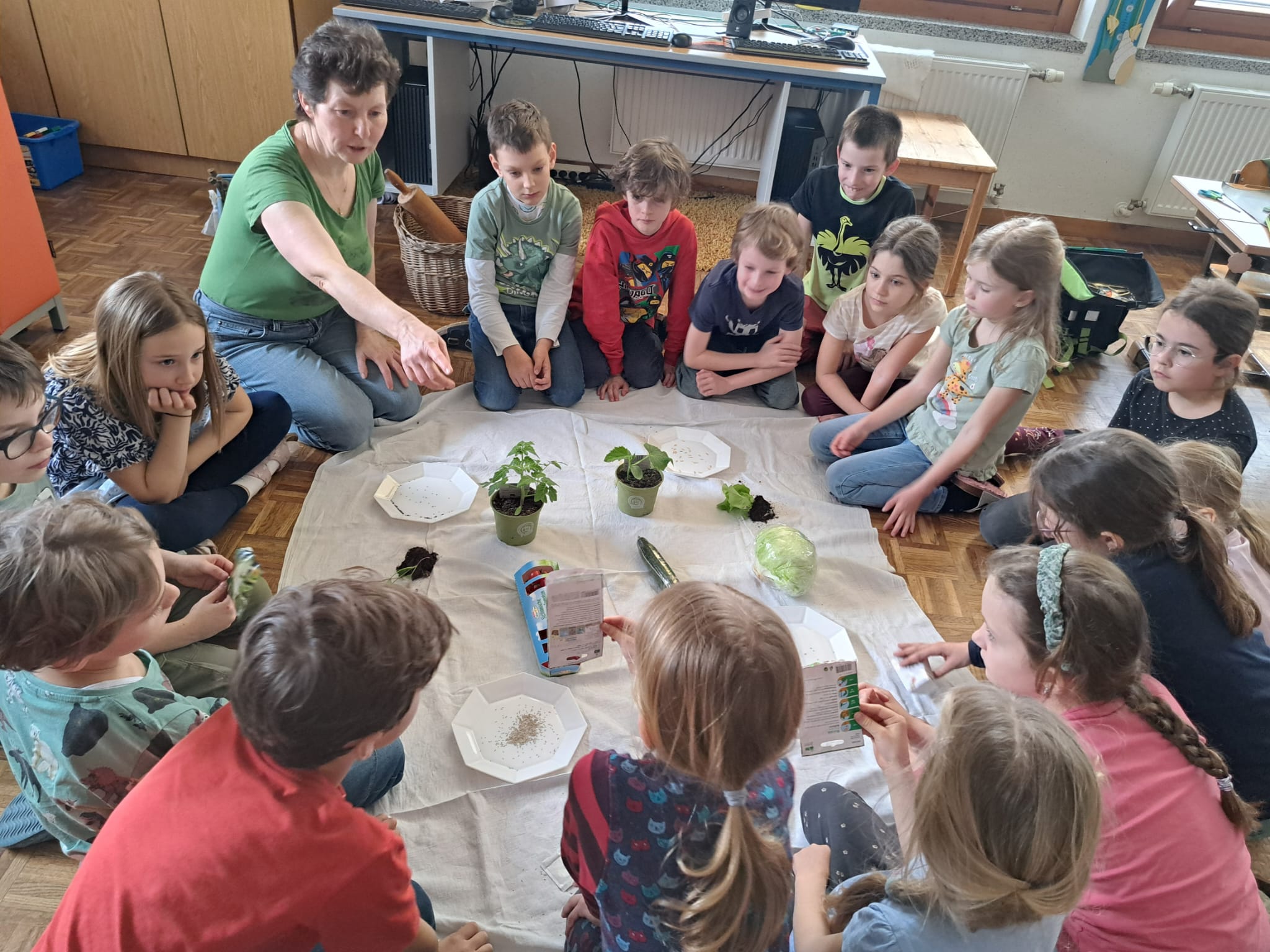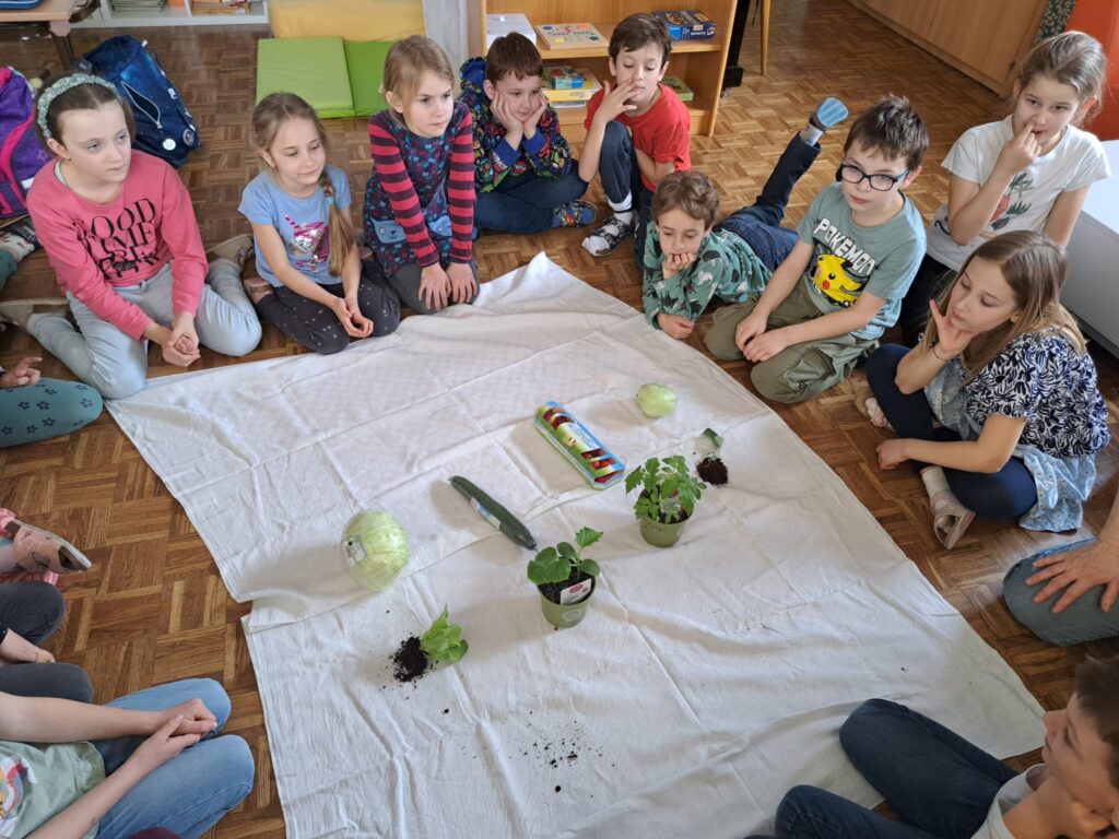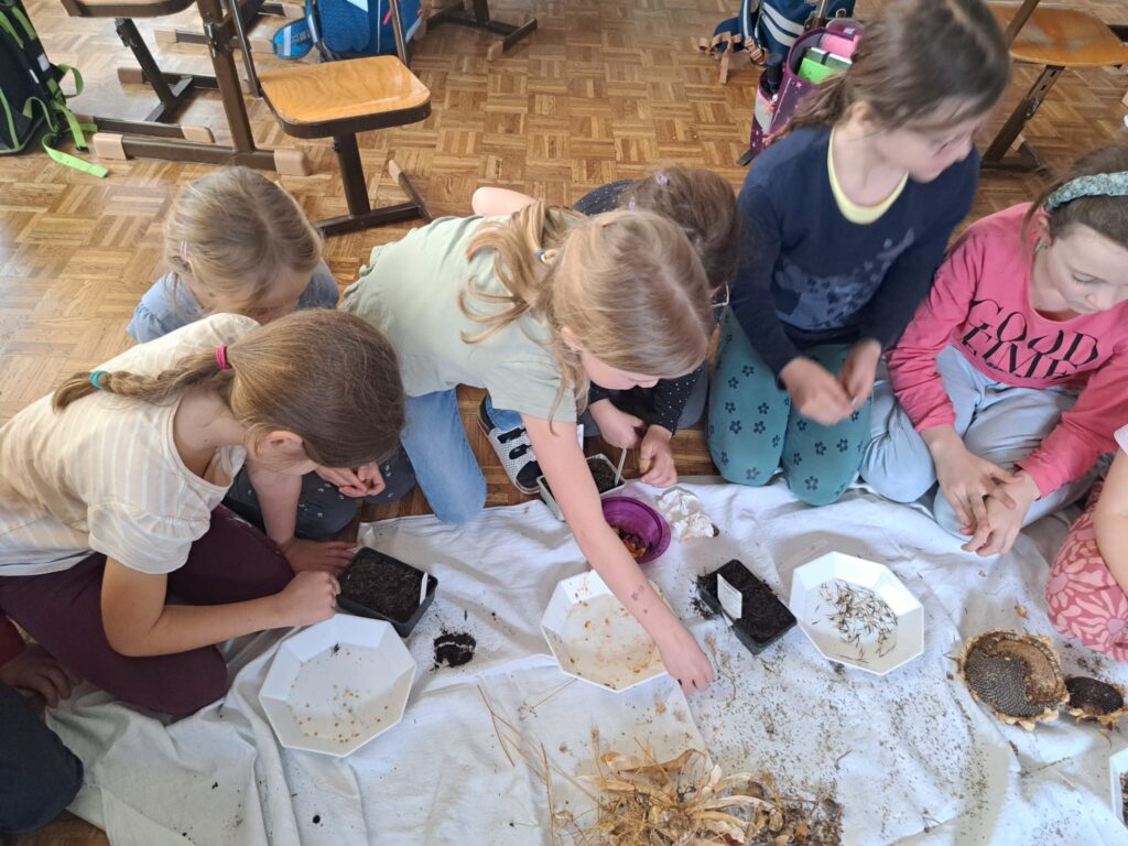 Zuvor besuchte Frau Rotteneder die 2. Klasse und erklärte den Kindern, wie und woraus Gemüse wächst und wo die Samen für verschiedenste Pflanzen zu finden sind. Anschließend durften die Kinder selbst die Samen in die Erde pflanzen.