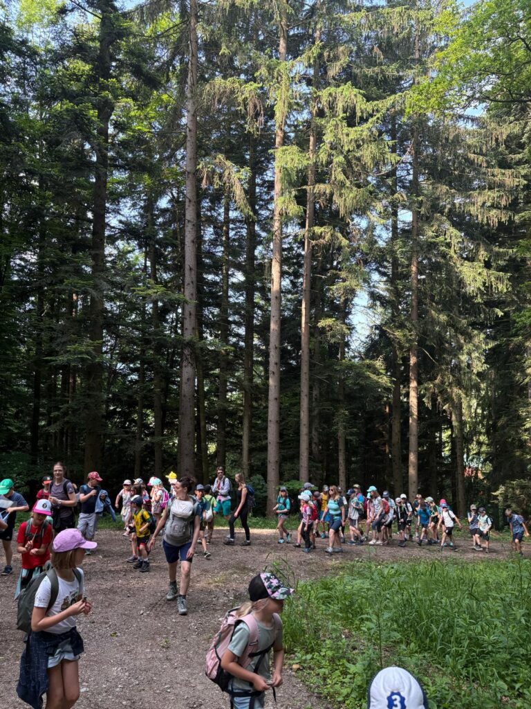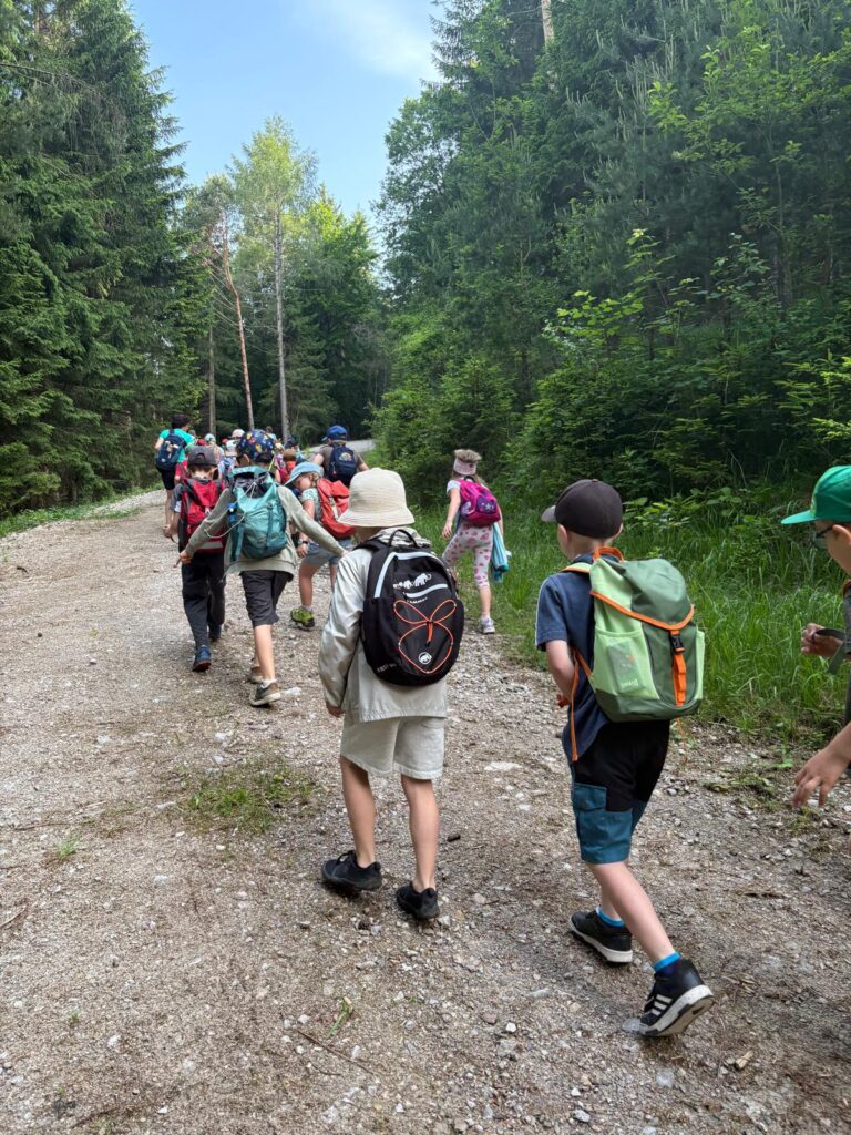 Bei strahlendem Sonnenschein machte sich die gesamte Schule am 6. Juni auf zu einem besonderen Wandertag, der vom Elternverein organisiert wurde. Vom Schulgebäude vorbei am Volleyball- und am Tennisplatz, über einen kleinen Bach und hinein in den Schlosswald – bis hinauf auf den Hirschlberg. Dort konnten sich die Kinder bei einer kurzen Pause im Wald stärken.