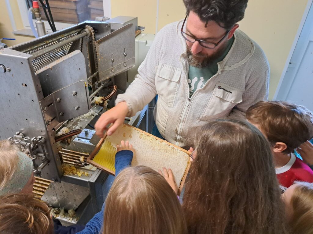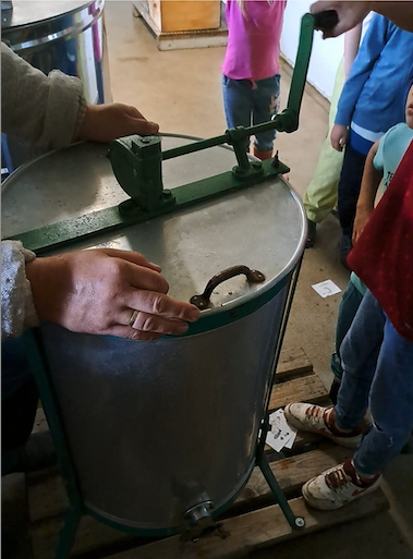 Gemeinsam bestaunten wir an diesem Tag die faszinierende Arbeit, die sich hinter der goldgelben Köstlichkeit, dem Honig, verbirgt. Außerdem konnten wir in einen Bienenstock blicken und viel Spannendes über die fleißigen Bienchen lernen. Viel Spaß machten es den Kindern, die Honigschleuder auszuprobieren und im Schau-Bienenstock unter tausenden von Bienen die Königin herauszusuchen.